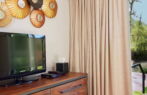 Inside, the studio is thoughtfully outfitted for comfort and convenience. The kitchenette includes a refrigerator, microwave, portable single-burner induction cooktop, toaster, dishware, and a Keurig K-Cup coffee maker—with complimentary K-Cups, cream, and sugar to start your mornings right. For your convenience, laundry is available on site in the amenities building next to the Riverside patio.