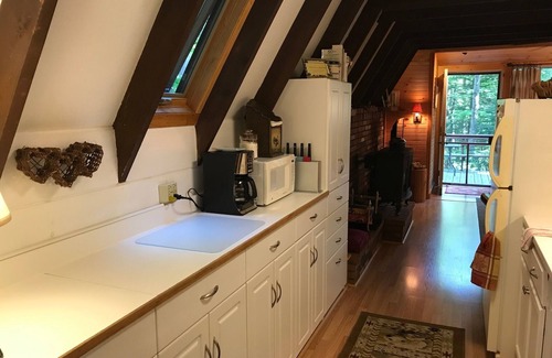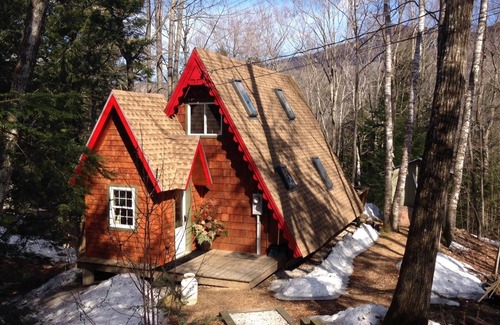 Mountain retreat says it all! Our A-frame home is a place where we disconnect. From the deck, you can enjoy the sounds of the Eastbranch River, many birds, and the peace and quiet of the mountains. We see quite a bit of wildlife including bear, turkey, fox, an occasional deer or moose, and at night we hear owls a lot. Many nights have been spent outside enjoying time with friends and family by the fire pit. Our home is designed for the outdoor enthusiast in mind.. Comfortable and casual, clean and inviting. Great front entry to store all your gear, which opens into a galley style kitchen. It's small but well stocked so you'll only really need to bring food. Spices, basic ingredients, and plenty of cookware are there for you to use. The main living area has a sofa, 2 leather chairs, and plenty of space for kicking your feet up and enjoying the gas fireplace after a fun day out. There is a dining table that seats 4 comfortably which looks out to Mt Kearsarge and Mt Surprise in the winter (the sun rises from this direction and is quite beautiful). The bathroom is on the main level as well. As with most A-frames, there is access to the upstairs by way of the ladder type stairs. Kids love it, however it isn't for everyone. Upstairs there are two bedrooms... one bedroom with a queen bed and the other with 2 twins. Both are small but very comfortable with tempurpedic mattresses and luxurious bedding.