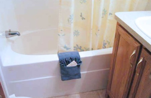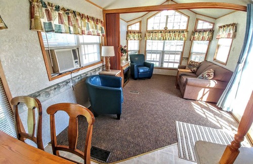 This cabin sleeps 6 people or more if you use the children’s sleeping loft. It features 2 separate bedrooms with a queen bed in each, plus a living room with a full sized fold-out-bed that can be closed off with an accordion door to create a 3rd sleeping area in that half of the living room. It also has a full kitchen with full sized cook stove, refrigerator and a built in microwave, electric fireplace and 2 full bathrooms with tub and shower. A patio door that leads out onto a deck, picnic table and Charcoal grill. Approx. 570 sq. ft. Plus Sleeping Loft.