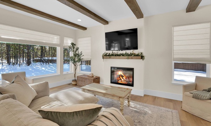 INDOOR LIVING: Electric fireplace, Smart TV, 4 private laptop-friendly workspaces, expandable dining table (extra chairs in garage), breakfast bar, board games, puzzles, guitar