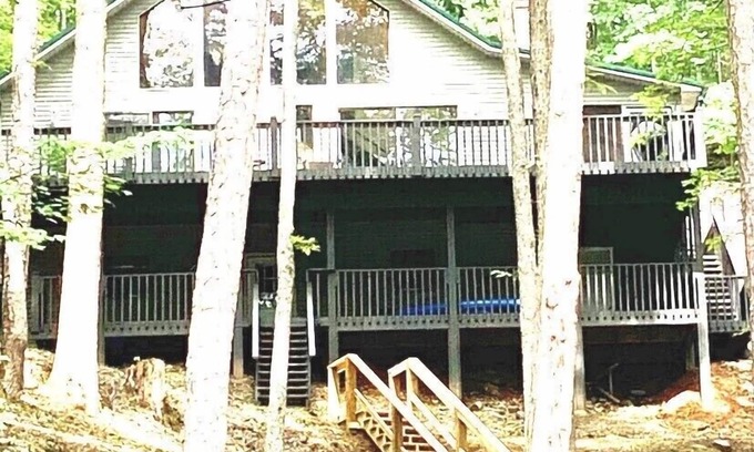 This newly renovated house is right on the lake in a cove. It has three bedrooms, two bathrooms, and sleeps six. There is an unfinished basement that is set up for table tennis and has a seating area. On the main level there is a kitchen stocked with dishes and cooking items, a seating area with a wood-burning fireplace, and a TV that can be used to watch movies on either the DVD player or your favorite apps (Netflix, etc . . .). This house also has a landline phone and Wifi if needed, but it is in the mountains so the idea is to unplug! There are two outdoor decks. The upper deck has a charcoal grill, deck chairs, and a table with an umbrella (updated pictures coming!). The lower deck has stairs to the lake and and entry to the basement where you will have access to two kayaks and some rafts. There is also a screened in porch at the main entrance. Down by the water there is a deck for relaxing and stairs to take you down to the floating dock in the cove.