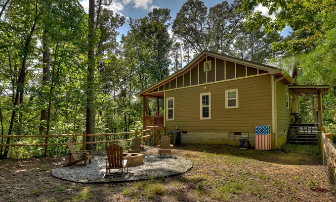 Mountain Livin' beckons with pet-friendly charm, complete with a fenced yard, soothing hot tub, crackling firepit, and reliable WiFi | Cabin in Ellijay