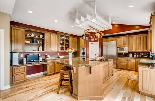 This is a spacious home with over 6000 square feet of living space on three levels. Four of the five bedrooms have attached bathrooms. The house is filled with wide open spaces full of sunlight, and is tastefully decorated. The kitchen is huge with granite counter tops, hardwood floors, and a mountain decor.
