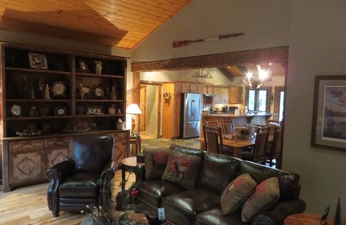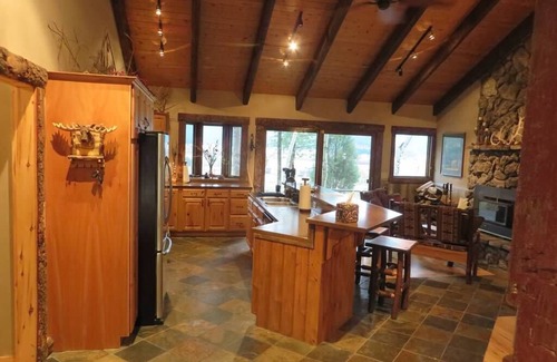 The large vaulted living area accommodates everyone in an open space which includes the kitchen, dining room and great room with fireplaces. The spacious kitchen is fully equipped and features gas stove, stainless appliances, concrete countertops. Off the kitchen you will find a large deck with majestic mountain views. Cabin is 2,000 sq feet with 2 bedrooms & 2 bathrooms - 2 bedrooms & 1 bath and 1 bedroom and 1 bath located on either side of the main living area. Wi-Fi available.