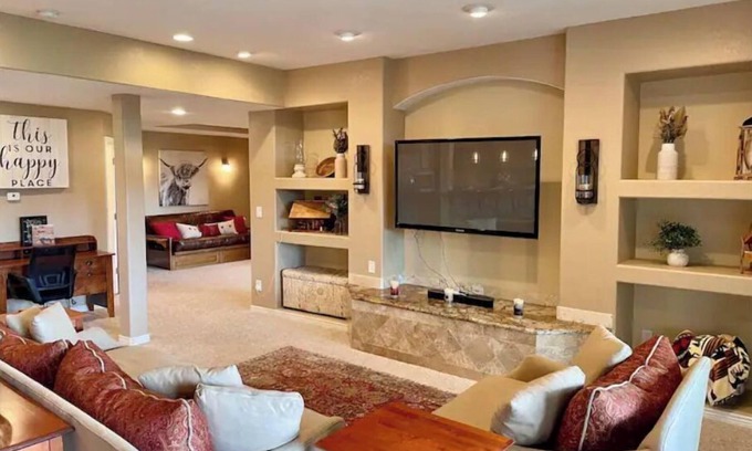 You'll have 2400 sq ft of private living space on the 1st floor of our 2 story home. The space includes 2 large bedrooms each with their own TV, 2 1/2 granite and tile bathrooms, a full size futon, a separate work space, a family room with a large TV, and a well-equiped gourmet kitchen with a center island for indoor dining. Outside there is a huge patio that includes a brand new grill, fire pit, swing, dining area, bistro table, propane heaters, and edison lights from which to enjoy the INCREDIBLE views. Watch the occassional trains in the distance as they sweep across the valley as if you are in Switzerland.