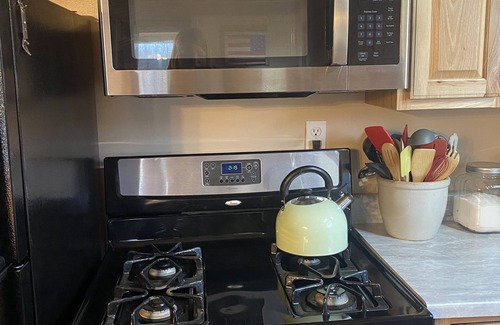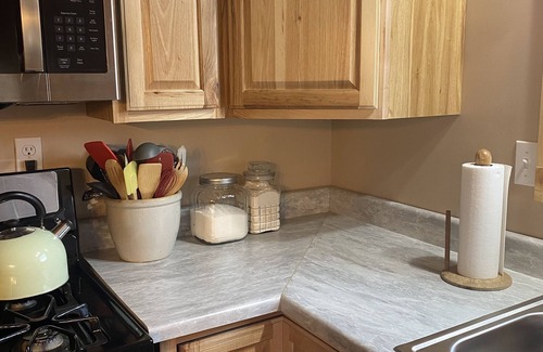 Kitchen has all appliances and utensils that can be found in your home. Teapot, coffee pot/keurig combo, double toaster, crock pot, gas range stove, microwave, refrigerator with freezer, ice trays in freezer, garbage bags. There are storage containers, strainer, tea pitcher, large soup bowls, lots of coffee mugs!, pots and pans, sheet pans for the oven, etc. The kitchen will also have Pam spray, sugar, flour, salt, pepper, and an assortment of spices available.