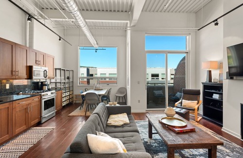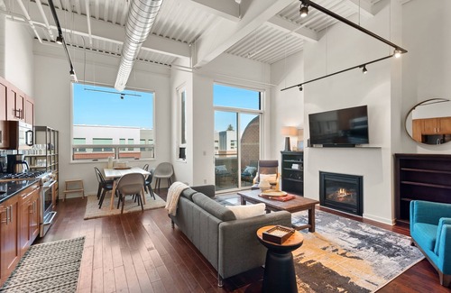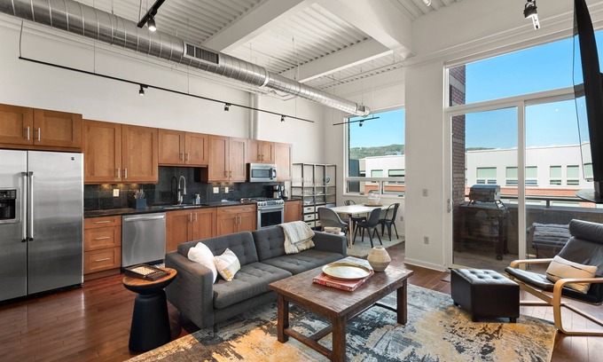 Each day begins with Colorado sunshine flooding into your top-floor loft, where high ceilings and a warm gas fireplace invite you to linger just a little longer. The open-concept kitchen, dining, and living space is designed for connection—whether you’re sharing a home-cooked meal from the fully equipped kitchen, indulging in takeout from the many eateries just outside your door, or gathered around the large smart TV for a family movie night.
