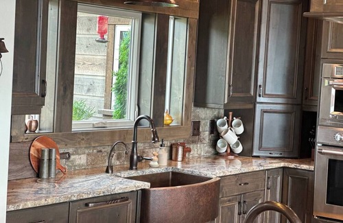 The upper level, which is the main level of the home, has a well-appointed chef’s kitchen fully equipped with all the modern amenities you need to whip up a delicious meal. Complete with Thermador appliances, a bar sink and an expansive eating counter that leads into the living room, the heart of this home is perfect for gathering with friends and family. The gorgeous floor-to-ceiling natural rock fireplace offers an additional spot for some quality moments to be spent together. The mudroom can be found on the main level as well and includes a commercial washer and dryer. There is radiant in-floor heating throughout the entire home, which combined with the fireplaces, makes the house super cozy; perfect after a day of skiing or playing in the snow! Step out onto the large covered deck to enjoy your morning cup and take it all in!