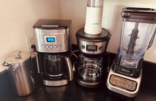 We are pleased to supply our guests with all the essentials to enhance the value and comfort of our home. The property comes stocked with linens and towels, paper products (TP. paper towels. facial tissues), bathroom toiletries (shampoo, conditioner, bar soap, hand soap, air fresheners) and a fully array of kitchen essentials (full spice rack, sharp chef's knives, cooking and serve ware for large groups (Crock pot, Air Fryer, Belgium Waffle Iron, Ninja blender, Microwave, 2 French presses + 2 large auto coffee makers + coffee grinder) plus a variety of cleaning supplies, dish detergent, dish soap & trash bags.