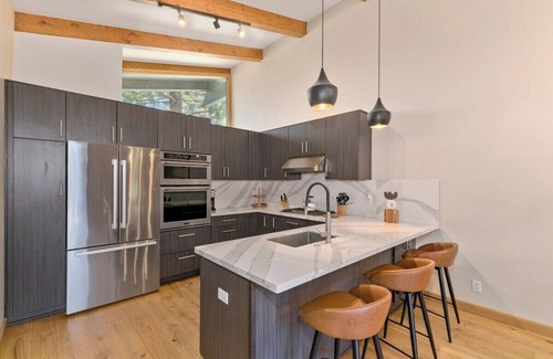 Conveniently located on a tree-lined street at the foot of the Sherwin Mountain Range, Mountain Modern with Swiss Flair offers easy access to all that Mammoth Lakes has to offer. Just minutes away from ski lifts, scenic lakes, shops, and restaurants, you and your guests can enjoy a wide array of local attractions without hassle. With the free town shuttle nearby, exploring this picturesque area including Lake Mary and Mammoth Creek Park is effortless, making it an ideal location for weddings and year-round mountain adventures alike.