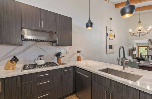 The amenities at Mountain Modern with Swiss Flair are thoughtfully curated to cater to your every need. The newly enlarged kitchen is a chef's delight, featuring quartz countertops, a gas range, and brand-new appliances, ensuring you’re well-equipped for any catering requirements. Relax in one of the two master suites, each boasting private bathrooms and custom features that radiate luxury and style. After a day filled with wedding festivities, unwind in the community hot tub or take a refreshing dip in the indoor heated pool, both located just steps from your front door.