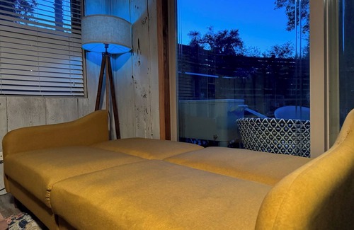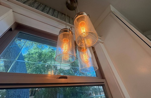 Outside there is a deck and seating area, a grill, corn hole, life-sized Jenga and a great view of the giant boulders in the park adjacent to the property. This place is especially beautiful in the day but there are string lights across the yard for evening enjoyment.