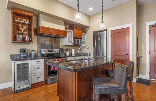Warm & inviting, spacious & luxurious. One bedroom with pull out sofa for additional sleeping. Large Spa inspired bathroom, large private patio with BBQ, large living room fireplace with smart TV above plus small fireplace at the foot of the bed with tv mounted above also. Open concept kitchen, living room with dedicated dining area. Walking distance to downtown Canmore, restaurants and shopping.