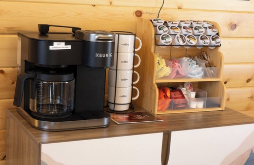 Kitchen—The fully stocked kitchen features a fridge, range, toaster, crockpot, microwave and dishwasher, along with dishes, pans, utensils, and basic spices, and a fully stocked coffee and tea bar (tea, coffee, sugar, creamer, and honey).