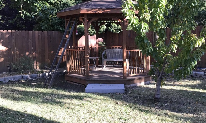 Fully fenced yard with outside gazebo/picnic area and bbq for your use.