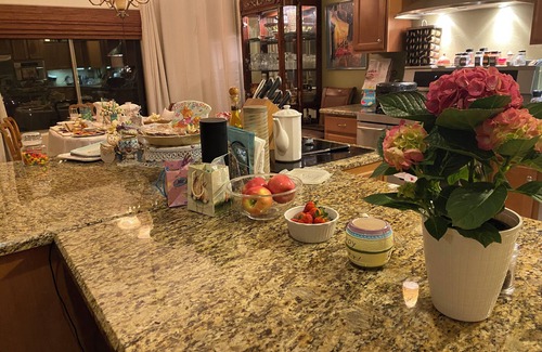 This beautiful home is on the hills over SaddleBrooke, not in the community. 2 bedrooms, 1 Queen and 1 Full pull out sofa. Has 1 Bath with dual sinks, and a tub/shower combo. A huge great room with 80” TV and fireplace. A large gourmet kitchen and dining room. An office with desk and comfy recliner chair (no futon). Resort patio with an outdoor kitchen, fire-pit, and fountain. Dual love seat and recliner on patio with a table for 6. This elegant property has everything you need for a comfortable stay. Enjoy bicycles, during your visit. Very quiet and relaxing. The great room has a shared common wall to another guest suite. Rarely can anything be heard from there. Quiet hours observed. The neighborhood is outstanding on hills that have breathtaking views of most mountain ranges. The home has fabulous sunset views out of all of the windows. Yard is walled in fence. One side is common area, where the Deers like to play. A beautiful place to do nothing or enjoy the area.