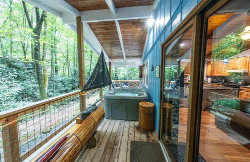Mountain Shadows is a comfortable cottage built next to a babbling brook. Imagine driving down a country lane to a cottage nestled in the woodland. The cottage is on a quiet, peaceful street conveniently located between Brevard and Hendersonville, NC. There is a large porch where you can eat meals outside, have your morning coffee, or just enjoy relaxing in the mountain air. The Hot Tub is on the covered porch also; overlooking the babbling brook. There is a nice view of the woods and longer range views during winter time.