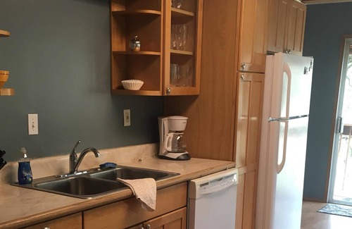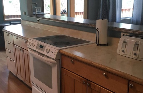 Kitchen has all appliances, microwave, four burner cooktop and oven, fridge and freezer to make those yummy meals! Bar seating fits 7 guests comfortably.