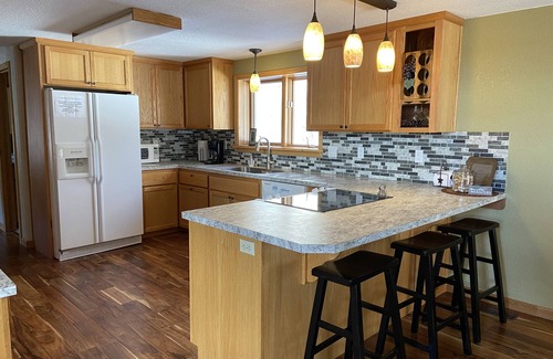 Our Mountain Valley Getaway is nestled up to the woods in the Centennial Valley with wonderful views of the mountains. We are situated on 4 private acres. Enjoy the sound of the rippling stream from the back porch along with the abundance of wildlife that like to wander through area. We are minutes away from the Medicine Bow National Forest/Snowy Range where the adventures are endless. The Snowy Range Ski Area is a short 15 minute drive. The Great Room, with it's vaulted ceiling has a hand layed stone fireplace, hardwood floors and is well appointed with leather furniture. It has south facing windows with a walkout to the new front deck. From here enjoy the Centennial Valley and views of the Snowy Range and Sheep Mountain. On a clear day you can see the mountains of Colorado. The Dining area has seating for 9 with a walk out onto a covered back porch. The Kitchen is well equipped with all the necessary amenities. The Master Bedroom with Master Bath is spacious with a handmade log king size bed and dresser. The Master Bath has recently been updated with a ceramic tiled walk in shower. Wake up to morning views of Centennial Ridge and the Snowy Range. The Guest Bedroom looks across the backyard and is complete with a queen bed and dresser. The loft overlooks the Great Room and has a queen bed and two twin beds. Free Wi-Fi is available for all your personal devices. Smart TV available with numerous apps to log into your favorite streaming company.