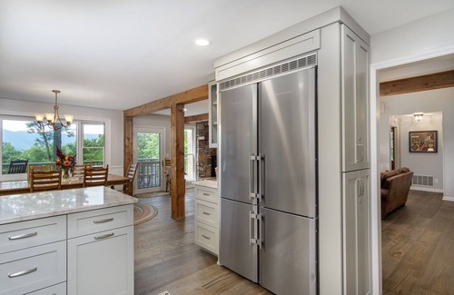 Modern comforts meet Montreat in this lovely home. Mountain View offers a vista of the Blue Ridge Mountains from the expansive wrap-around deck. In the mornings, grab a cup of coffee and watch as the sun rises over Rainbow Ridge before setting out for the day. Spacious and clean, the cathedral ceilings and large windows in the main living space allow for lots of light. Spend your evenings together, munching on some popcorn, in front of the wood-burning fireplace as you watch a movie on the large smart TV in the living room. Or, battle it out over a game of air hockey or pool in the garage game room. Dine together, either inside at the table with space for eight, or outside on either level of the porch. Grill out on the driveway with the charcoal or gas grill. Equipped with A/C, heat, wifi, and cable television - you'll have everything you need to enjoy your Montreat getaway.