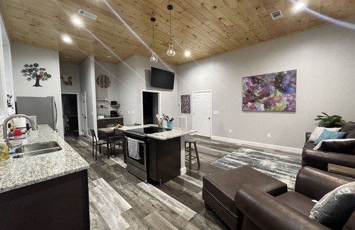 There is a large bedroom (complete with a king- sized bed, sheets, blankets and pillows as well as a walk-in closet), one full bathroom (stocked with towels and complimentary toiletries); a spacious, fully stocked eat-in kitchen (with brand-new appliances to help bring out your “inner chef” or just relax and enjoy a delicious take-out meal); a quaint coffee bar for those tea and coffee lovers (with complimentary tea and coffee); a living room with flat-screen tv; internet; a large pull-out sofa (with a queen size mattress for the kids or extra guests); as well as a washer/dryer to make your stay a little easier after an enjoyable (yet sometimes dirty) day in nature hiking, fishing, biking, or just exploring all the captivating areas of Tennessee and all they have to offer.