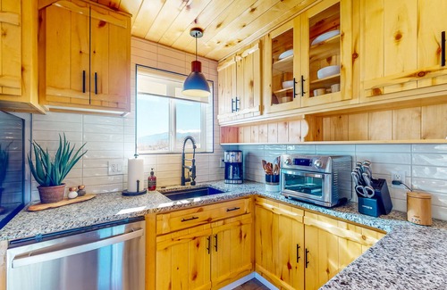 Inside your cozy cabin, a well-appointed studio design offers plenty of space to spread out and relax - unwind into vacation mode in the sitting area and stream your favorite TV shows. The convenient kitchenette includes a full-sized fridge, dishwasher, sink, convection oven, and a portable electric induction stove. Dining space abounds between granite countertop seating and a large table.