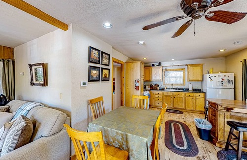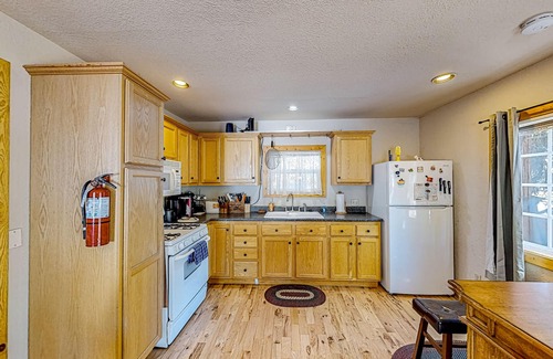 Upon entering, you'll feel right at home in the inviting atmosphere. The cozy living room is centered around a gas fireplace, perfect for providing an intimate ambience for reading a book picked from the shelf. You can also kick back with some cable or stream your favorite movie. If your holiday time requires any remote working, the desk in the upstairs bedroom has you covered.