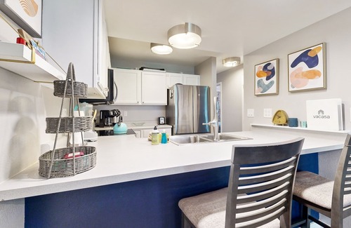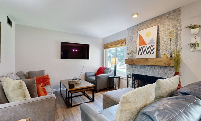 This family-friendly condo features a small, private patio with a comfortable seating area and a propane grill - the perfect spot for warm-weather barbecues and to enjoy the outdoors while still being at home. If you are visiting during the summer months, the sparkling community pool awaits. The interior boasts a cozy, home-like atmosphere with a wood-burning fireplace in the living room and comfortable furniture throughout. Prepare delicious homemade treats for the crew in the well-equipped kitchen, complete with stainless steel appliances.