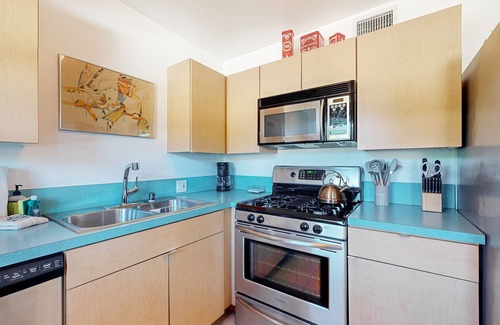 Filled with art and sunlight, the open interior of your stay is a place of pure peace. Catch up on your favorite TV show from the comfort of the living room's sofa. Prepare your favorite dishes amidst the full kitchen's stainless steel appliances and ample meal prep space. And when it's time to eat, gather with your loved one around the dining table.