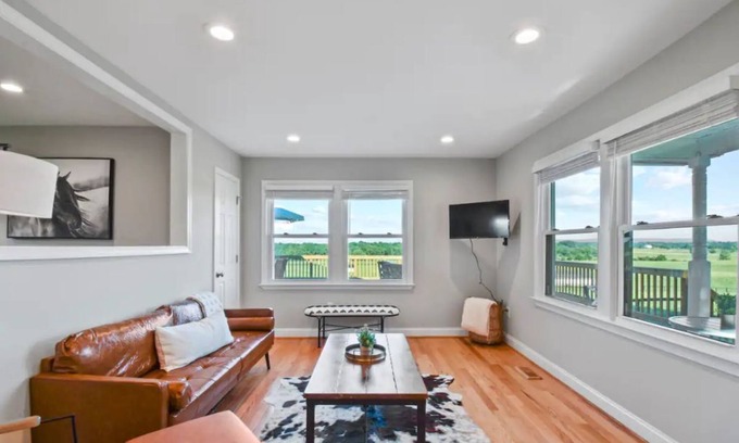 Forget your worries in this spacious and serene space. Kick back & relax on our spacious wrap-around porch overlooking our 66-acre working horse farm while enjoying a view of the Blue Ridge Mountains. Enjoy sipping your morning coffee on our front porch, spend the night by our firepit enjoying smores & drinks, and be sure to take a walk around our farm to pet our horses and walk the grounds. Our home is a newly renovated modern farmhouse.