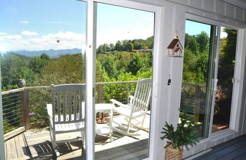 Perfect honeymoon retreat or vacation mountain escape. Incomparable sweeping panoramic MOUNTAIN VIEWS to enjoy from both your DECK and sun room areas, as well as your spacious living room, of this gorgeous Ridgecrest Mountaintop Villa. Note the elegant European Flair. Wake up to the sound of chirping songbirds, then spend your morning relaxing over breakfast in the exquisite sunroom or on your private open-air DECK. After a day of GOLFING or HIKING to spectacular area WATERFALLS or shopping for mountain crafts and antiques, light up the bar-be-que for private dining on your matchless open deck. GOLF COURSE is public and for your enjoyment. There is no better way to experience the Great Smoky Mountains of North Carolina. No restaurant can compare in ambiance to these surroundings; but if you want to treat yourselves to a night out, there are wonderful RESTAURANTS throughout the area. Just let us know what you like and we'll share our favorite places with you. If you choose to stay close to your Villa, you might enjoy morning or evening strolls throughout the valley. This villa is settled into a mountain ridge in the safe, gated GOLFING community of Mill Creek Golf and Country Club in Franklin NC near the APPALACHIAN TRAIL and the BLUE RIDGE PARKWAY. For your convenience, access to the villa is easy, paved and level. The interior is light and bright, with contemporary European styling. Master Bedroom includes a king-sized bed, and tub-shower.