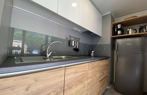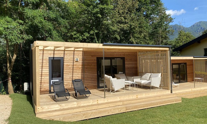 Discover the Mountain View Lodge L, a charming accommodation that is perfect for families, couples, and groups of friends with a fantastic view of the picturesque mountain landscape of Lago d'Idro. This modern and tastefully furnished holiday home offers space for up to 4 people and promises an unforgettable holiday experience.The apartment has two cosy bedrooms with a total of three beds - one double bed and two single beds - and is ideal for couples or families. The electric heating and air conditioning ensure a pleasant room climate in every season. The fully equipped kitchen invites you to cook together and offers everything a holiday heart desires: refrigerator, dishwasher, coffee machine, toaster and complete kitchen equipment.The highlight of the accommodation is the dreamlike terrace of 22 m², which offers a breathtaking view of the garden and mountains. Here you can spend relaxed hours with your family or friends and enjoy the tranquillity of nature. A private parking space and the proximity to the picturesque Lago di Idro make this place even more attractive.In the surrounding area, you can expect numerous attractions: The town of Crone is only 1.5 km away, the holiday resort has a beautiful mini market with a bakery, a sophisticated à la carte restaurant, a pizzeria, and much more. The pool and a modern fitness centre are just a few metres away.Pet lovers, take note: One pet is allowed, and smaller groups are also welcome. Enjoy your holiday in this inviting accommodation that perfectly combines comfort, nature, and relaxation!