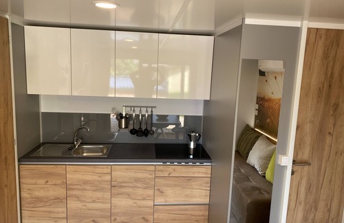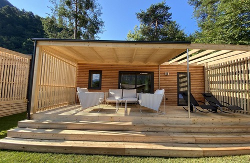 Discover the Mountain View Lodge XL, a charming accommodation that is perfect for families and couples. This modern and tastefully furnished holiday home offers space for up to 6 people and promises an unforgeable holiday experience.The house has three cosy bedrooms with a total of 5 beds - one double bed and four single beds - and is ideal for families or groups of friends. Two comfortable shower rooms ensure sufficient privacy and comfort during your stay.The fully equipped kitchen invites you to cook together. With a ceramic hob, refrigerator, dishwasher, coffee machine, toaster and complete kitchen equipment, you have everything you need for culinary delights. A television with international channels provides entertainment.The accommodation offers electric heating and air conditioning for your comfort. A private parking space is available, and the 26 m² terrace with garden furniture invites you to relax. The community pool is an additional highlight.The location is dreamlike: Only 150 metres from the picturesque lake, the accommodation offers a breathtaking mountain view. At the glamping resort, you will find many service offerings and leisure activities.Pets are allowed by arrangement. A perfect retreat for nature lovers and families seeking peace and nature!