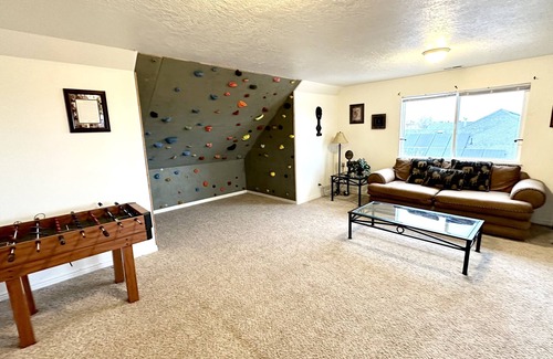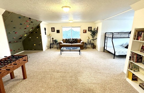 Your stay at Mountain View Retreat includes a variety of amenities that ensure both comfort and entertainment. The house features a fully equipped kitchen, expansive living spaces, and a beautiful deck to enjoy panoramic vistas. You will find a bouldering rock wall for some indoor fun, numerous full bookshelves, and a game closet filled with activities for all ages. Sleeping arrangements are thoughtfully designed with memory foam mattresses across several rooms, offering 12 beds in total, including king and queen size options. For larger gatherings, extra floor mattresses are available, and there’s also a basement apartment that can host additional guests, complete with its own kitchen and theater room.