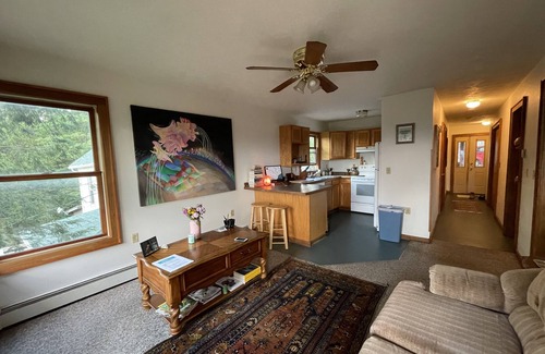 This two bedroom apartment is new to short term rental. It has a glorious view of the mountains and the city of Elkins is located in a very peaceful neighborhood and is an easy walk down town. It has a washer, dryer, dishwasher, and kitchen supplies. There’s a front deck by a nice garden to pick fresh food and herbs from, and a back deck overlooking the mountains and city.
