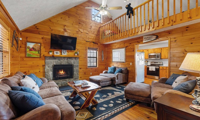 Indulge in the comforts of home with the cabin's thoughtful amenities, including a fully stocked kitchen, a cozy fireplace, and a convenient washer and dryer. Enjoy quality time with your loved ones in the spacious living room, or challenge them to a game of ping pong in the dedicated game room.
