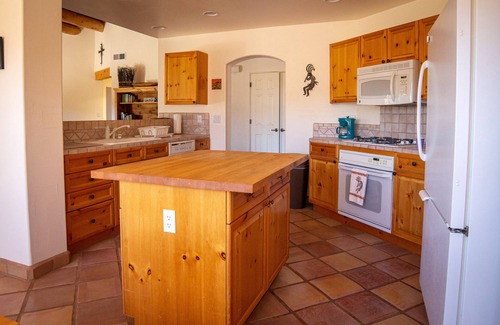 Kitchen equipped with Gas Stove top. Enjoy outside smoker/grill. Coffee pot, percolator, and grinder. mixing bowls and muffin pans. King bed, Queen bed and Two Twin beds. 3 bedrooms and 2 full bathrooms. Master bedroom with garden tub and walk- in shower. Washer and dryer. Games and puzzles. Two TV's and internet. Enjoy 2 acres in the Land of Enchantment!