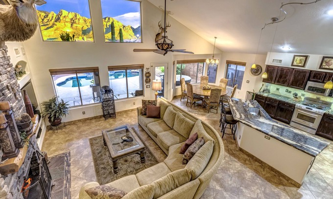 MOUNTAIN VIEWS, KOI POND, HOT TUB, POOL, 1GIG WIFI, 1/2 mile Starbucks/Safeway! is located in Rancho Vistoso. MOUNTAIN VIEWS, KOI POND, HOT TUB, POOL, 1GIG WIFI, 1/2 mile Starbucks/Safeway! provides accommodation, featuring Wellness Facilities, Fireplace/Heating, Hot Tub, among other amenities. This House features Wellness Facilities, Fireplace/Heating, Hot Tub, to make your stay a comfortable one.