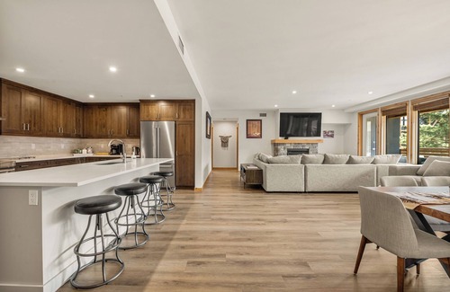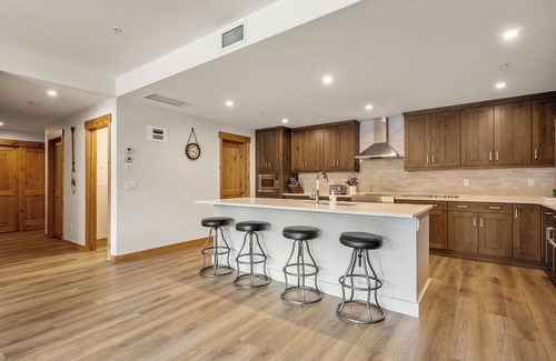 This unique suite features 2,300 sq ft of mountain-style living space in natural light with an open gourmet kitchen and dining area, a soaring gas fireplace, and geothermal heating and cooling in zone-regulated in-slab floors.
