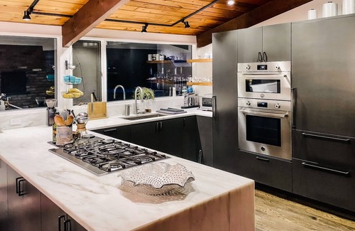 Upstairs is the primary bedroom with Walnut DWR King sized bed, large windows overlooking the mountains and brand new ensuite with Marble and Terrazzo tile, brass California Faucet fixtures and radiant heat floors. Across the hall is a great kids room with 2 twin beds and blackout curtains for light sensitive kiddos and a hall bathroom with large soaking tub. Head downstairs to the large mudroom complete with tons of storage for all your gear and shoes as well as brand new washer dryer and extra fridge/freezer for storage. Down the hall you'll find a huge guest room with DWR Queen bed and a wall of windows overlooking the mountains with newly renovated hall bathroom complete with Vermont Slate, Danby Marble Vanity and large tub. Next to the bathroom you'll find another good sized room with two twin beds and blackout shades if needed for the kids. The downstairs Family room has large flat screen TV, huge U shaped Room and Board sofa and modern wood burning stove to keep you warm and the kids busy with toys, games, books and Apple TV.