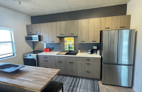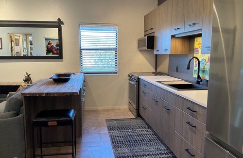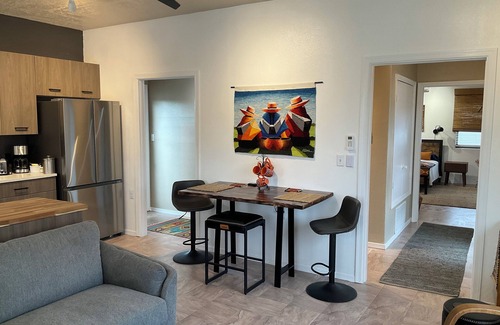 Escape to this fabulous, artistic, very spacious 1-bedroom Magdalena house, can sleep up to 3, short term or longer term retreat with mountain views. Enjoy the open-concept Great Room with comfortable sitting, TV, eating area & a truly state of the art kitchen. Relax in the beautifully appointed bedroom with a queen bed,+ twin bed, sitting area, desk area, complete w/ large closet. Enjoy the convenience of amenities like WiFi, AC/Heat and a separate laundry room with stack washer/dryer. The bathroom features a large & refreshing shower & pretty vanity area. The huge covered porch offers comfortable seating for up to 8 + a picnic table, mountain views & is a great entertaining space.