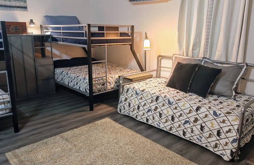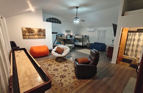 Our bunkhouse/gameroom is perfect for family fun, featuring shuffleboard, and board games. While the kids are entertained, you can relax in the great room by the fire or unwind on the balcony, both offer extraordinary views of the surrounding mountains as well.