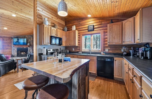 The wrap around deck overlooks the surrounding woods opening up to incredible valley and long range-mountain views. 6 person hot tub spa with lights situated on the deck for maximum viewing pleasure. The well-equipped kitchen with a center island has all the stainless steel modern appliances: dishwasher, microwave, electric stove/oven, coffee makers (a Keurig AND traditional coffee maker) and basic spices. One level living with 3 bedrooms: the master has a king size log bed, 43" flat screen TV and its own bathroom (bathrooms only have showers, no tubs). Another has a king size bed, and the third has two twin beds with the bathroom in between the 2 secondary bedrooms. All bedrooms have ceiling fans. Only 100% cotton bed and bath linens are provided. The great room has comfy leather furniture, including a sofa and two reclining chairs, a gas stone fireplace, handmade, rustic tables and bench and a 50” flat screen with Netflix. The dining table seats eight comfortably and looks out towards the incredible view. There is a gas fireplace in the great room for those chilly nights and central A/C for those balmy mountain evenings. Charcoal grill, picnic table, high top bistro table, propane fire pit and two person log swing on the deck. Dog friendly (please, no cats), you can bring your pups -up to two for a $75 dog fee. For those who can’t leave the tech world behind, the cabin has reliable WiFi and cell phone service at the cabin is reliable. Please check out our business at Dancing Bear Vacation Rentals of Asheville for more detailed information about our vacation rentals! All of our properties are dog friendly and have fenced in, secure areas for your pups!
