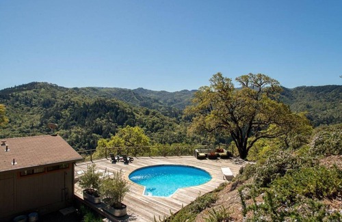 My home is in the heart of Mendocino wine country, just minutes from the town of Ukiah and 1hr 40min from SF. You'll love this property's open floorplan, clean home with spectacular mountaintop views taken in while lounging, eating, hot tubbing, and even showering (heated shower) poolside on a 21 acre property good for short walks and picnics. Has 3-4 acre fenced in area perfect for pets! Home is great for couples, small groups of friends, families and kids and pets. Deck hot tub for 6 overlooks scenic valley!