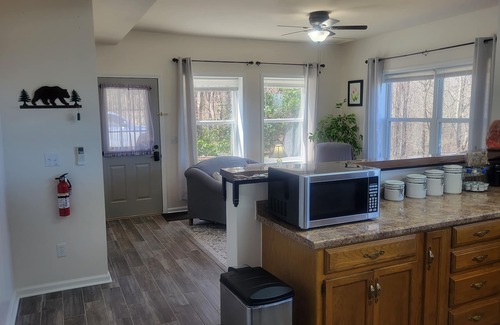 The apartment is all one level, smooth woodgrain tile floors with no stairs from entry or inside. Enjoy the full-sized kitchen (large frig/freezer for the trout you catch), cozy king size bed and in the living room a sleeper sofa that opens to a twin if needed. A desk for writing a post card to the grandchildren or setting up your laptop has its own little nook. Many board games, puzzles, Dish network (2 TVs) and internet/WIFI are provided for rainy days. A full size kitchen has a refrigerator, dishwasher, gas stove, microwave, toaster, 3 choices of coffee makers, small blender, mixer, and a crockpot. It is fully supplied with pots, pans, dishes and basics for cooking and cleaning. The bathroom has a full shower/tub. Laundry has washer/dryer, iron and board. Linens, towels and basic soaps are included. A wood firepit with a grill top and a gas grill are provided so you can cook out at the semi-covered outdoor area. One bundle of firewood per night's stay is supplied. Extra bundles of firewood can be requested for an additional fee of $6 per bundle. Month long renter includes weekly cleaning, change of linens and towels.