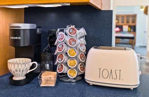 High ceilings, vibrant art, and a sunny open-concept design create a space that’s both stylish and welcoming. Whip up meals in the fully stocked kitchen, enjoy coffee in the breakfast nook, or gather around the dining table with views of the mountains and pool. A separate game room with air hockey, Karaoke, and board games brings fun for all ages.