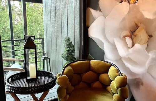 Upon entering, guests are immediately enveloped in an ambiance of sophisticated relaxation, designed with both style and comfort in mind. The home comfortably accommodates 5 to 7 guests across three elegantly appointed bedrooms and a versatile studio space with a sofa bed. High ceilings in the 16-foot-high living room create a spacious, airy feel, enhanced by large, sunlit windows. The living area is an entertainer's dream, featuring a large motorized screen with a 4K resolution projector and high-quality speakers, perfect for movie nights or catching up on favorite shows.