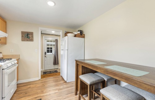 Inside, the home comfortably accommodates up to four guests with two inviting bedrooms. Rest easy on high-end Purple mattresses, featured in both the queen loft bedroom and the versatile downstairs room equipped with twin and trundle beds. For extended stays, a dedicated workspace with lightning-fast 1GB fiber internet, desk, chair, and printer ensures productivity at your fingertips.