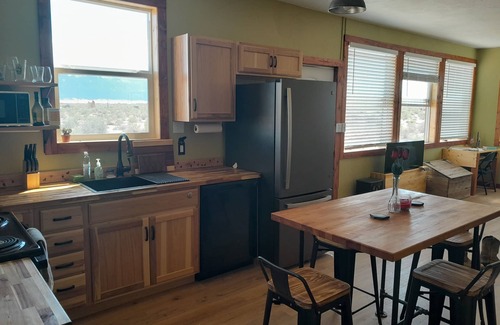 New one bedroom house, 780 square feet. Nine-foot ceilings, full kitchen, huge picture windows with mountain views in directions. Heavy on wood, log, and cabin design. Iron pipe prevalent as well. Large deck with chairs, table, gas BBQ.