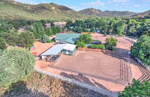 This charming ground-level studio guesthouse features two cozy queen beds, a well-appointed kitchen, and a private bath, making it a comfortable retreat for up to four guests. The property includes two horse stalls, a climate-controlled tack room, a lighted riding arena, and direct access to stunning trails perfect for horseback riding, hiking, or biking adventures. After a day filled with love and activities, unwind by the outdoor built-in kitchen, relax around the fire pit, or soak in the hot tub under the stars, setting the stage for unforgettable memories.